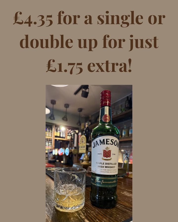 Looking for the perfect pour? 🥃 Join us for a smooth Jameson Irish Whiskey for just £4.35… or double up for only £1.75 extra 👀 Great value, great taste, and even better company—see you at the bar! 🍻