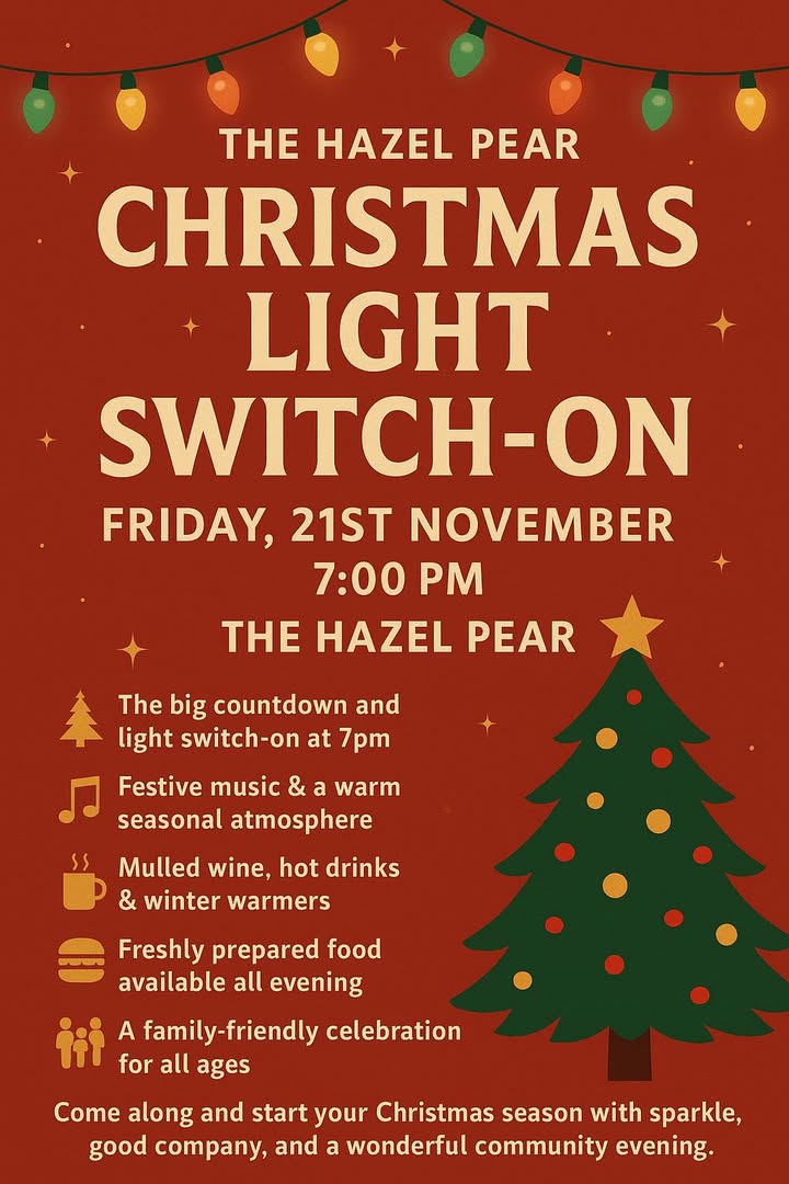 2 DAYS UNTIL WE LIGHT UP THE HAZEL PEAR ๐ Our annual light switch on fundraising for Hope House is this Friday eveningโฆ make sure to free up your calendars to see our lovely pub become the biggest star in the village. We hope to see you and your family there!!