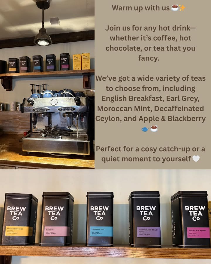 Warm up with us ☕✨ Join us for any hot drink—whether it’s coffee, hot chocolate, or tea that you fancy. We’ve got a wide variety of teas to choose from, including English Breakfast, Earl Grey, Moroccan Mint, Decaffeinated Ceylon, and Apple & Blackberry 🍎🫖 Perfect for a cosy catch-up or a quiet moment to yourself 🤍