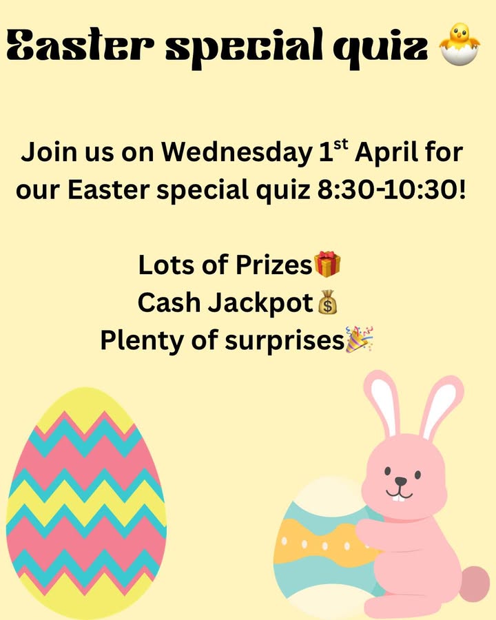 🐣🌸 Easter Quiz Night Special! 🌸🐣 Join us on Wednesday 1st April from 8:30–10:30pm for a cracking night of fun at our Easter Quiz Night! 💰 Cash Jackpot to be won 🎁 Prizes up for grabs 🎉 Plenty of surprises throughout the night Make a night of it – book a table and dine with us beforehand 🍽️ Gather your team, bring your A-game, and get ready for a great night you won’t want to miss! Book now on OpenTable to secure your spot!