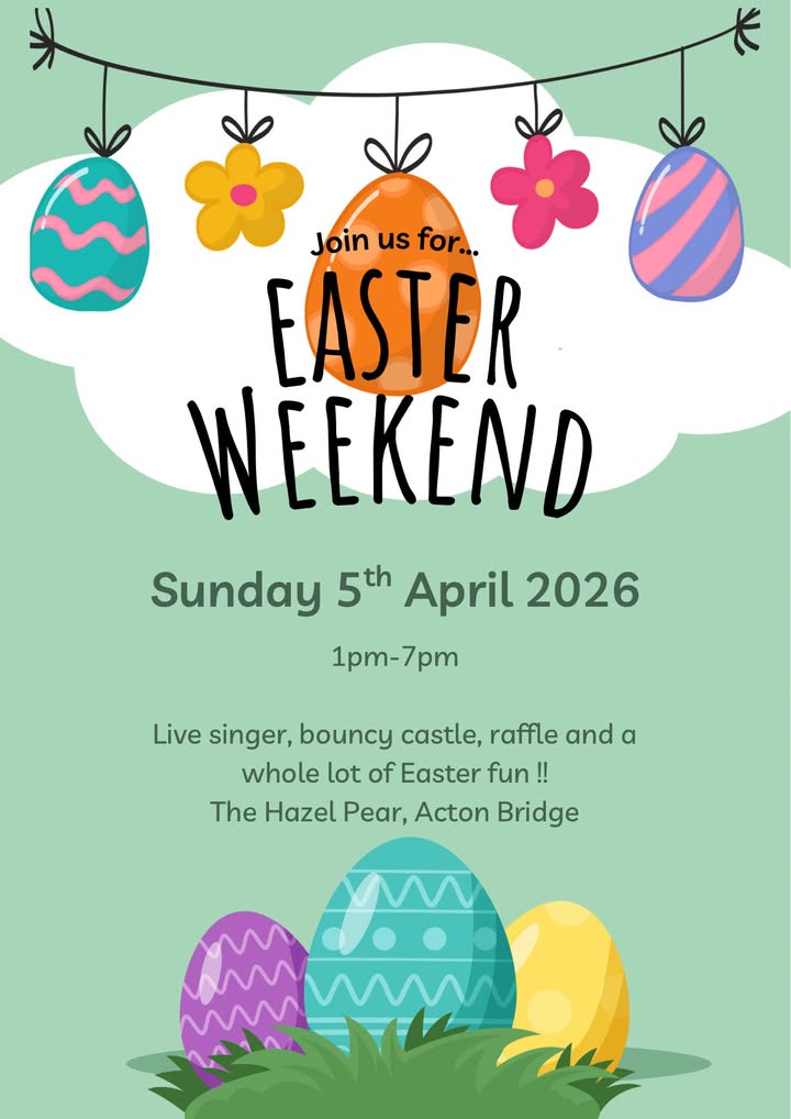 🐣🎤 Easter Sunday Live Music 🎶🐣 Join us at the The Hazel Pear this Easter Sunday (5th April) for a fantastic afternoon of live music with the amazing Sophie Bond! 🌟 🕔 5pm – 7pm Grab a drink, relax, and enjoy great vibes, great music, and even better company 🍻 Make your Easter Sunday one to remember — we’ll see you there! #EasterSunday #LiveMusic #ActonBridge #TheHazelPear #BankHolidayVibes